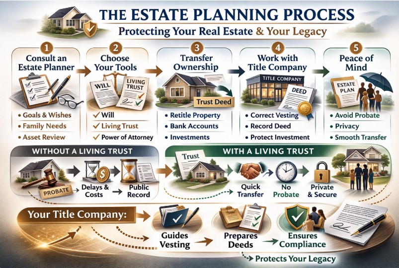 This is where a title company becomes an invaluable part of the process. Title companies play a key role in ensuring your real estate is properly vested, whether you are purchasing a property or transferring it into a trust. They can guide you on how to take title—whether as an individual, as a married couple, or in the name of a trust—based on your estate planning goals.